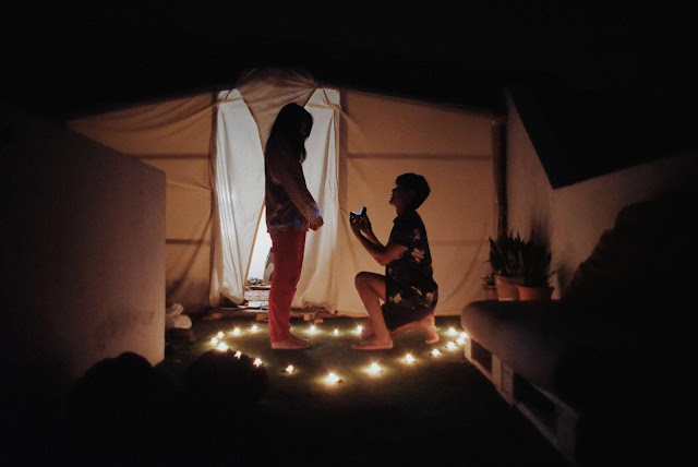I wiped away my tears, chucked those irrational thoughts aside, stepped out of the shower and headed back to our tent. And that was when I saw the candles on the floor. You held my hand and said that you had something to tell me. ‘Wow. He is really overdoing his apology,’ I thought, until I saw the camera on the tripod. I couldn’t believe it. I couldn’t believe that you would ask me for my hand after what we just went through; after what we just talked about. You looked me in the eye and started stringing up slightly touching but awkward sentences, in an attempt to recall what you had written. You finally gave up. And that was when you started tearing up. You said you didn’t know what the future would be like but you could never imagine it without me. That sentence yanked at my heartstrings. This was the boy that I first fell in love with, standing right in front of me, being completely honest, vulnerable and sincere. I didn’t need you to tell me that everything is going to be okay. I didn’t need solutions. What I needed to hear was that you cannot do life without me, as I cannot without you. And that gave me the courage to brave the storms of life with you, and to have the confidence that we would somehow stick together through it all. You asked if I would give you the honour of spending the rest of my life with you. I said yes.